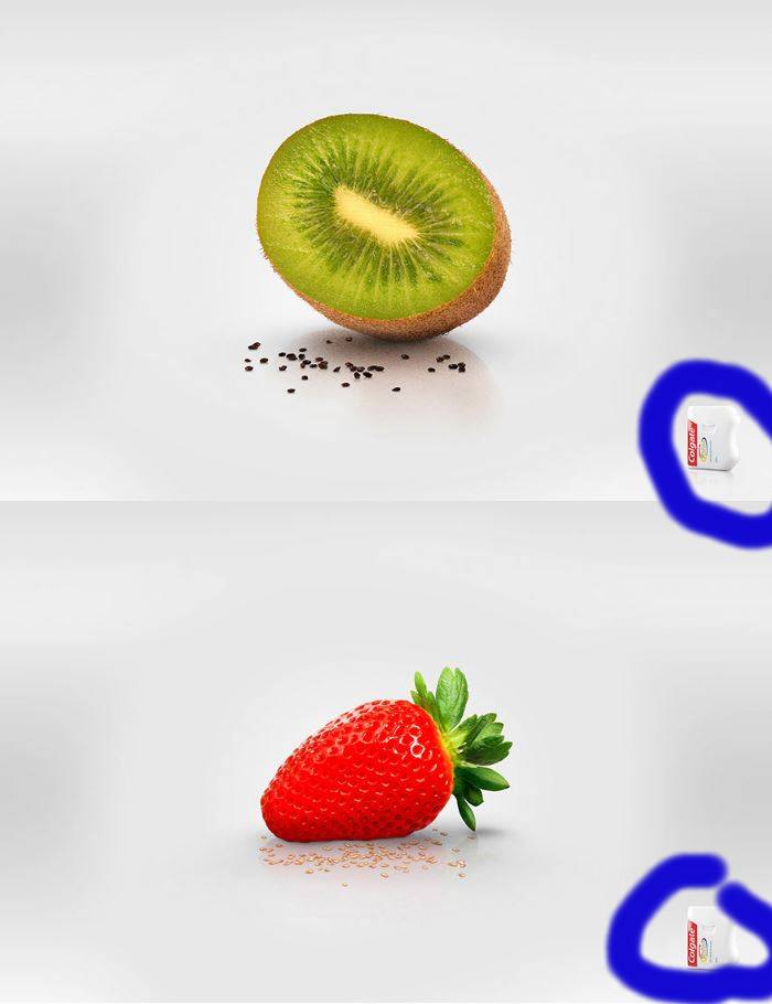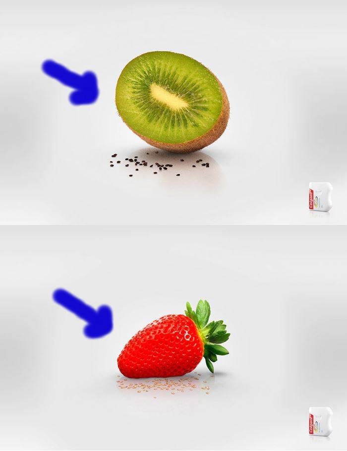 I noticed two main elements of contrast. One is the big kiwi and big strawberry contrasting with the small seeds from both fruits. Another element of contrast is the light gray background against the bright green and bright red fruit colors. Contrast needs to be strong to create visual interest. The artist definitely got the element of contrast in this ad.